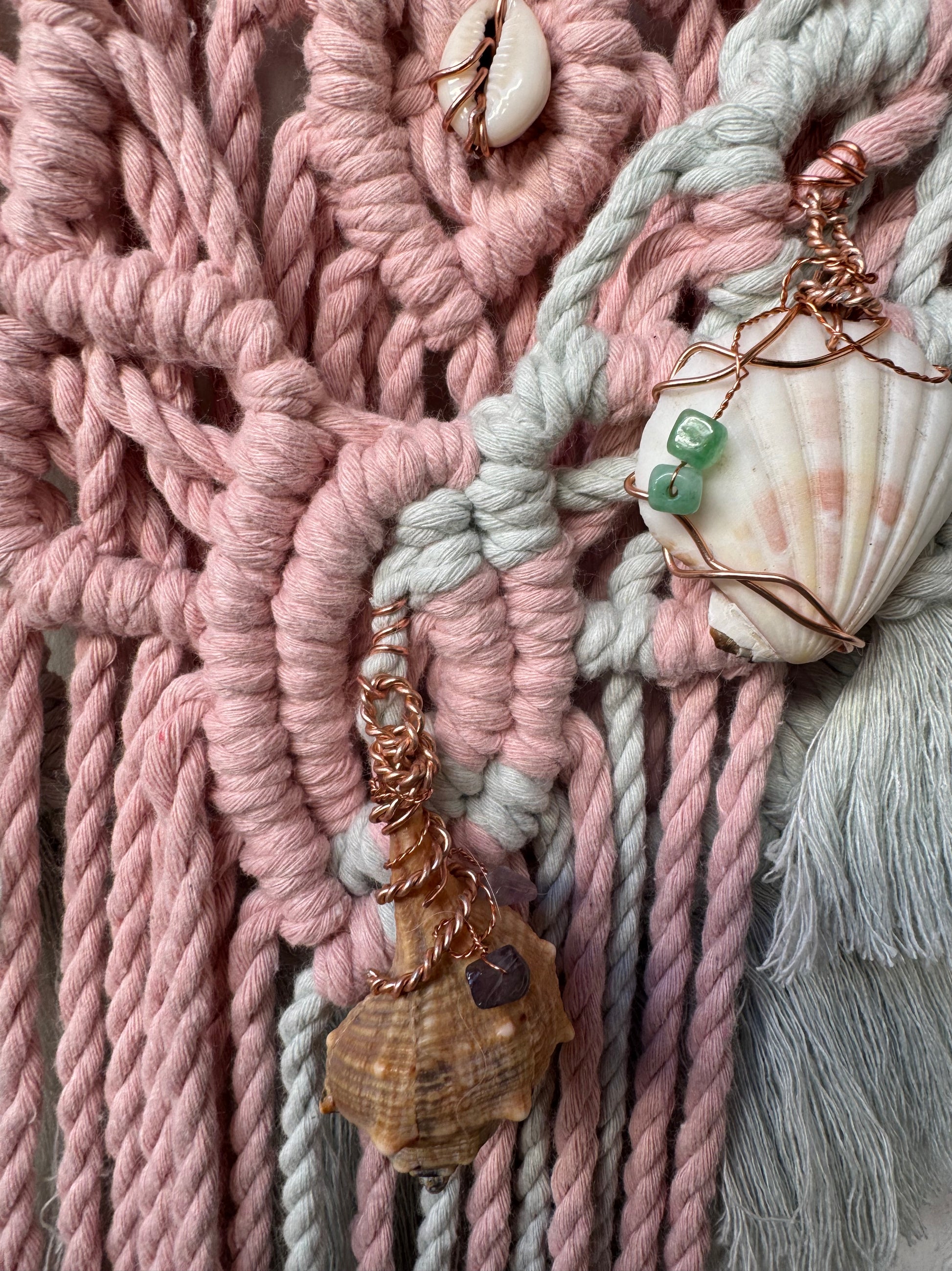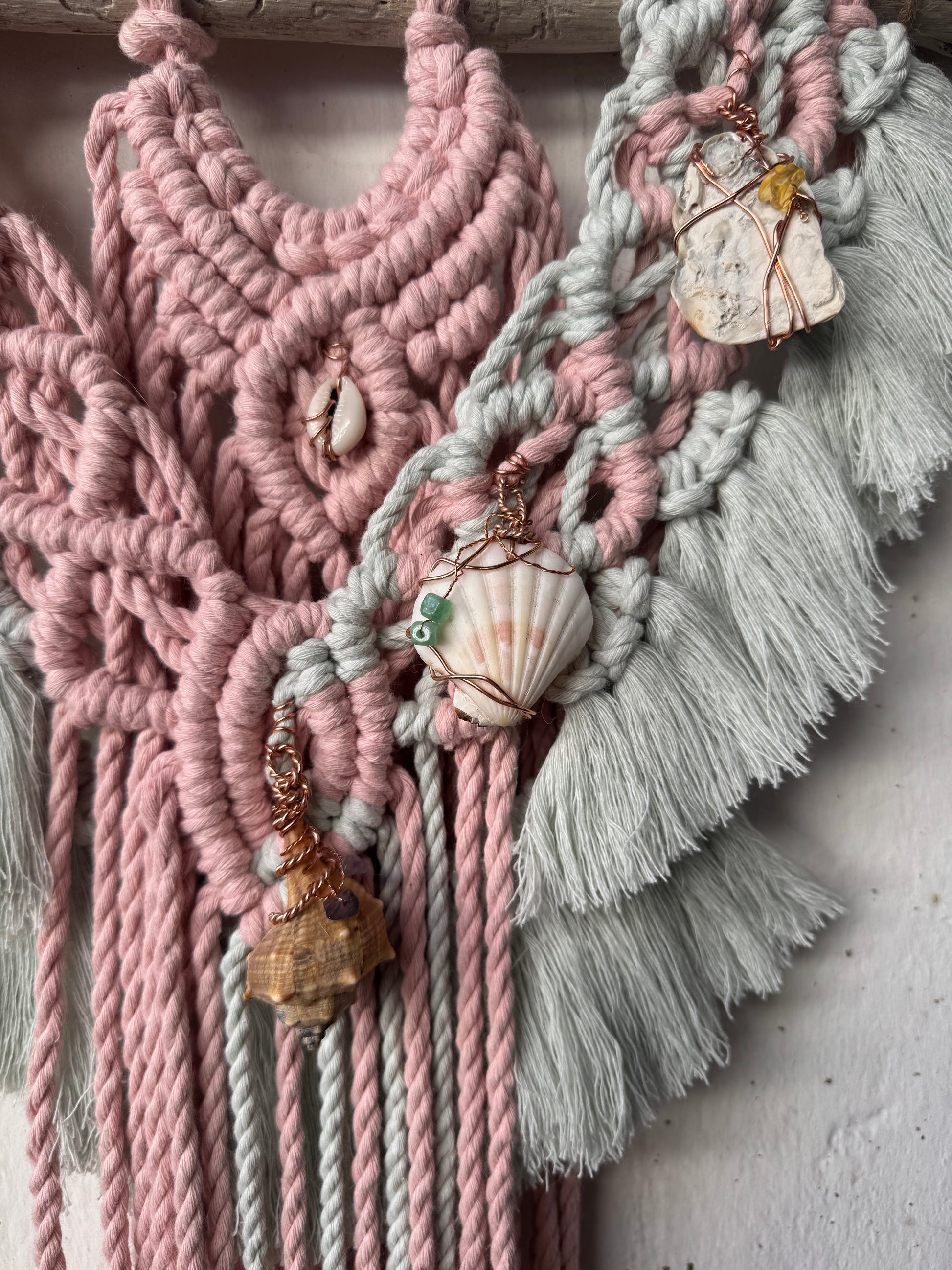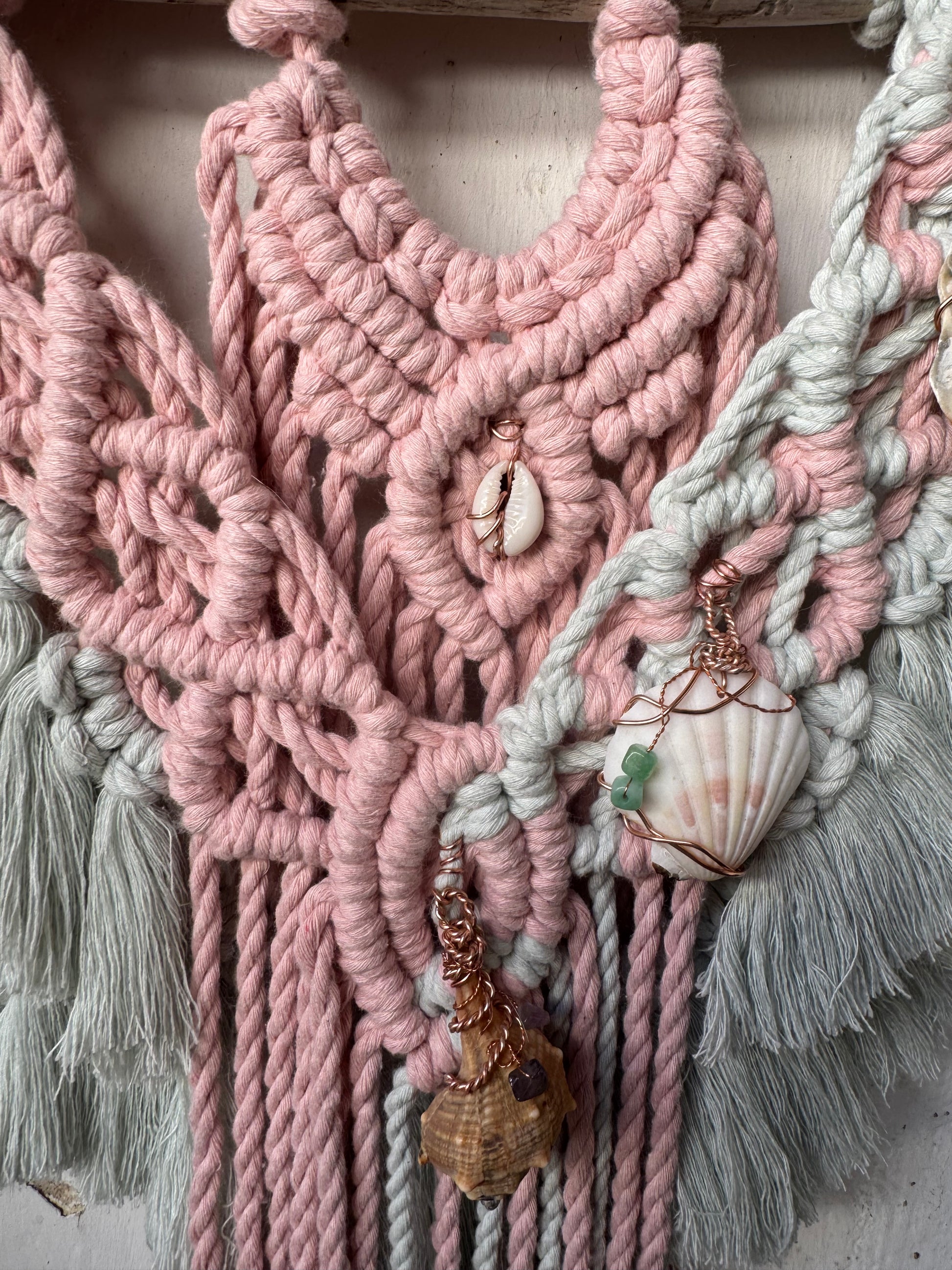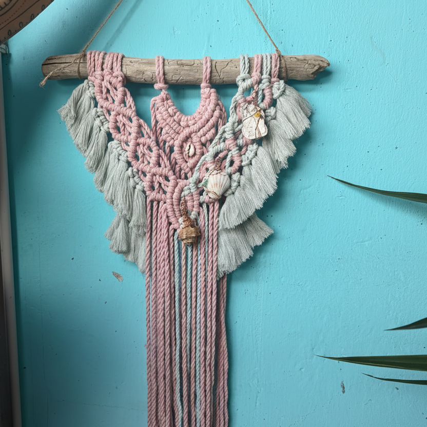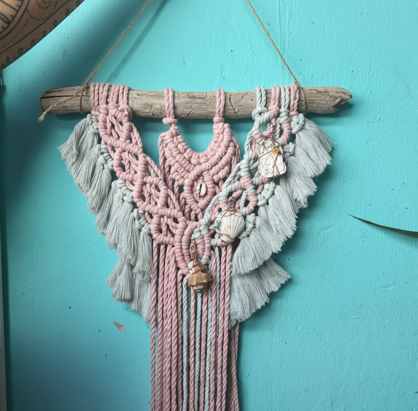 I fili scendono come radici leggere, ricordando che anche la delicatezza può essere forza. Il rosa sussurra cura, l'azzurro parla di equilibrio, di quel punto silenzioso in cui il cuore smette di difendersi e torna ad aprirsi.