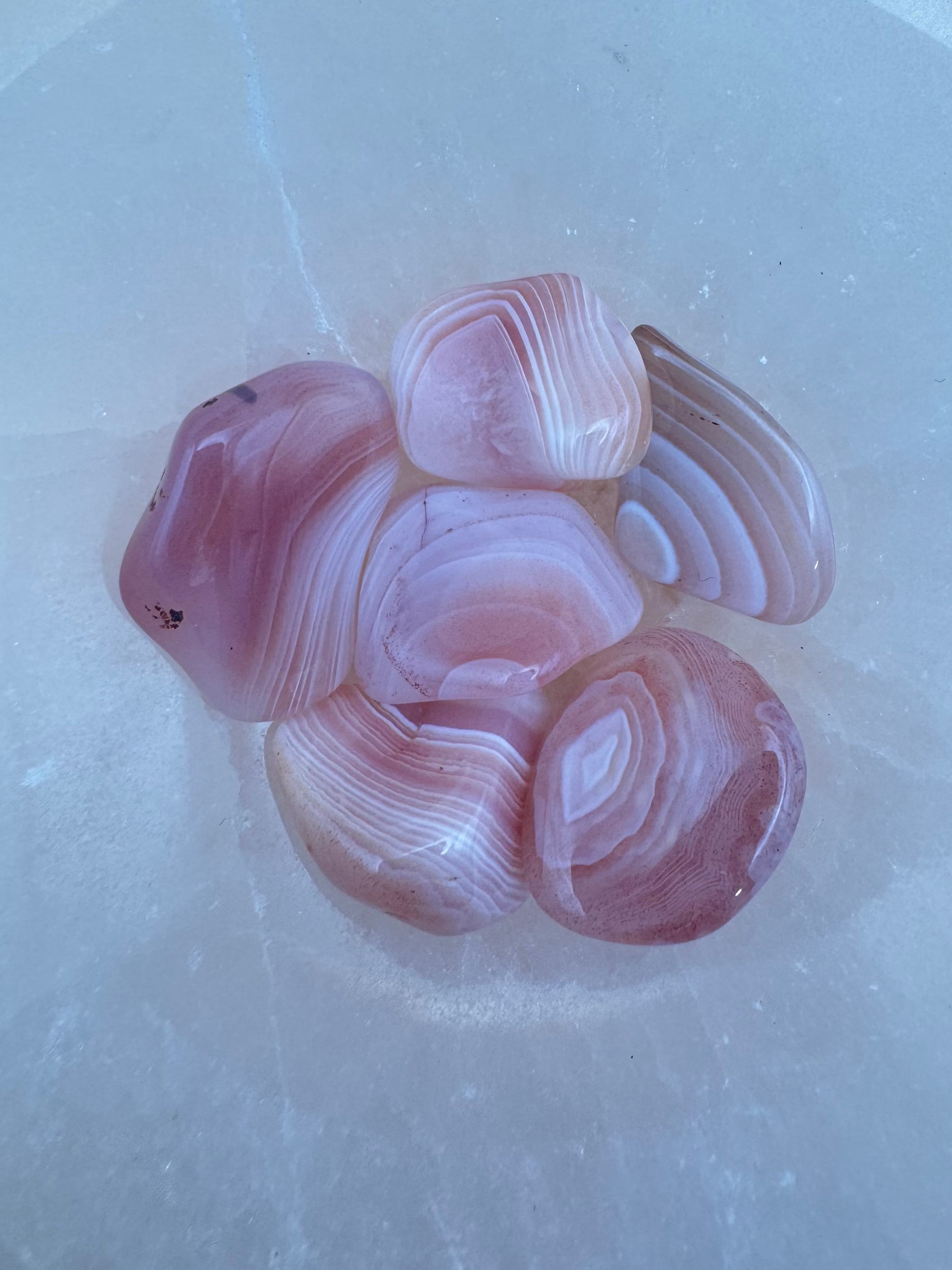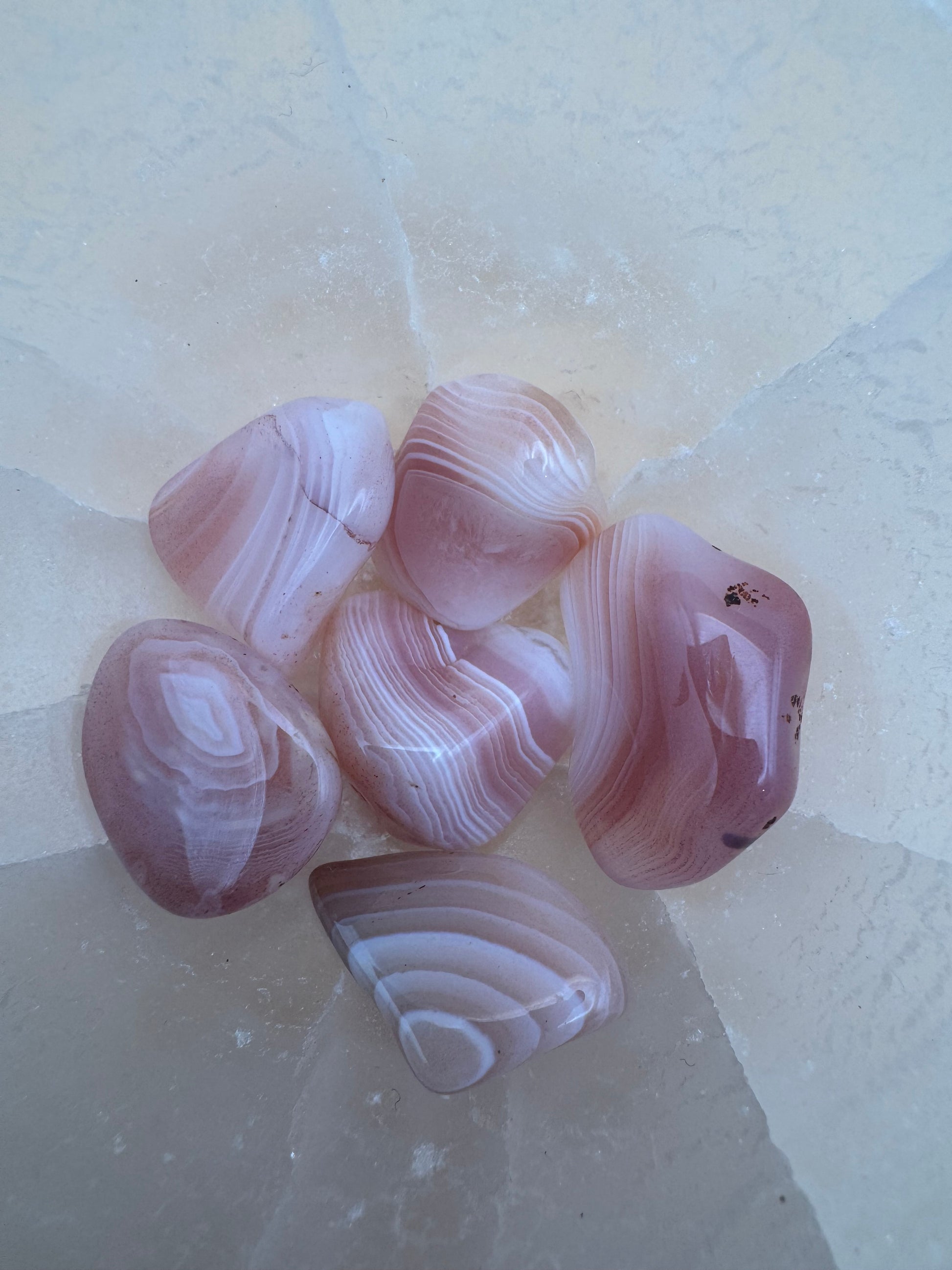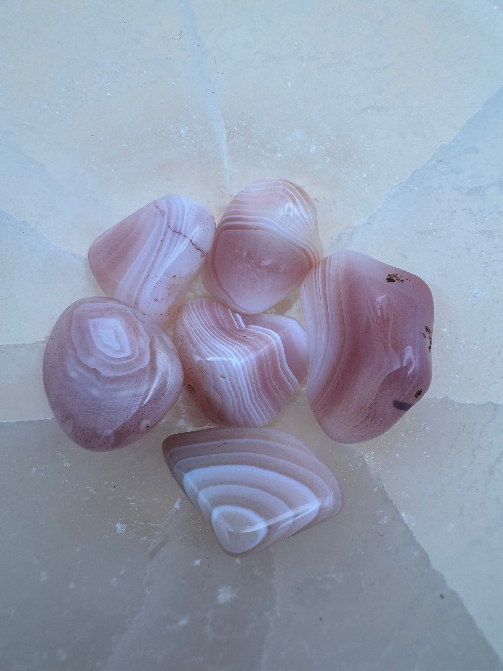 L’Agata del Botswana si distingue per le sue delicate sfumature rosate, grigio-malva e beige, attraversate da eleganti bande naturali che creano un effetto armonioso e avvolgente.