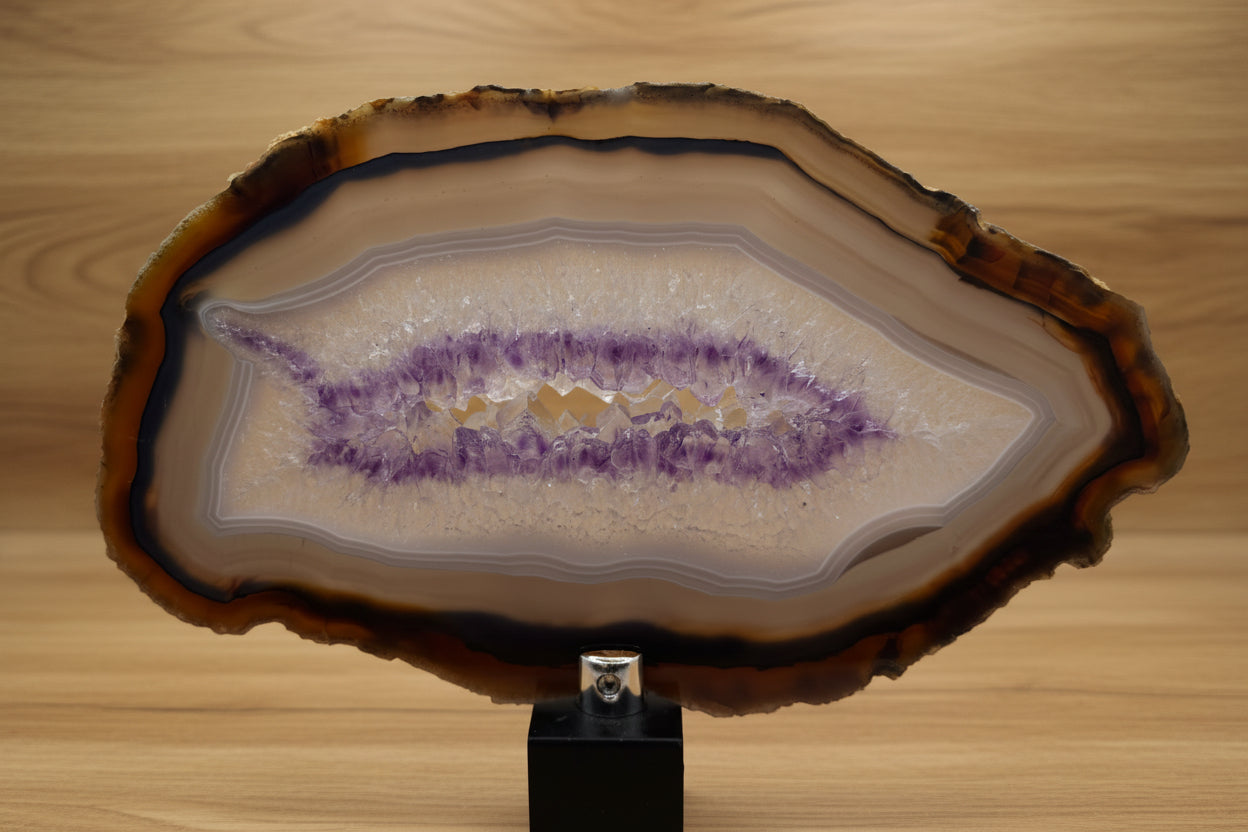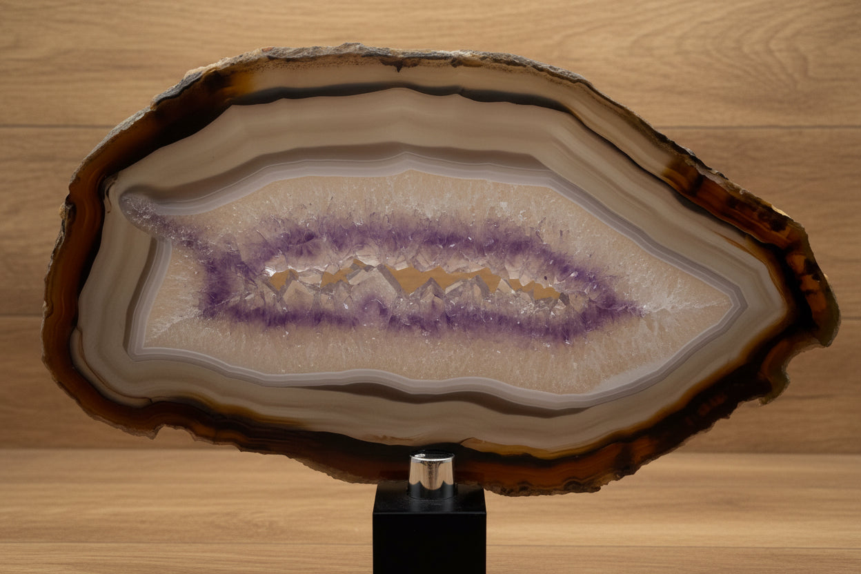 Questa fetta di Agata con Ametista proveniente dal Brasile è un autentico capolavoro naturale, dove la bellezza delle stratificazioni si unisce alla forza vibrante dei cristalli viola.