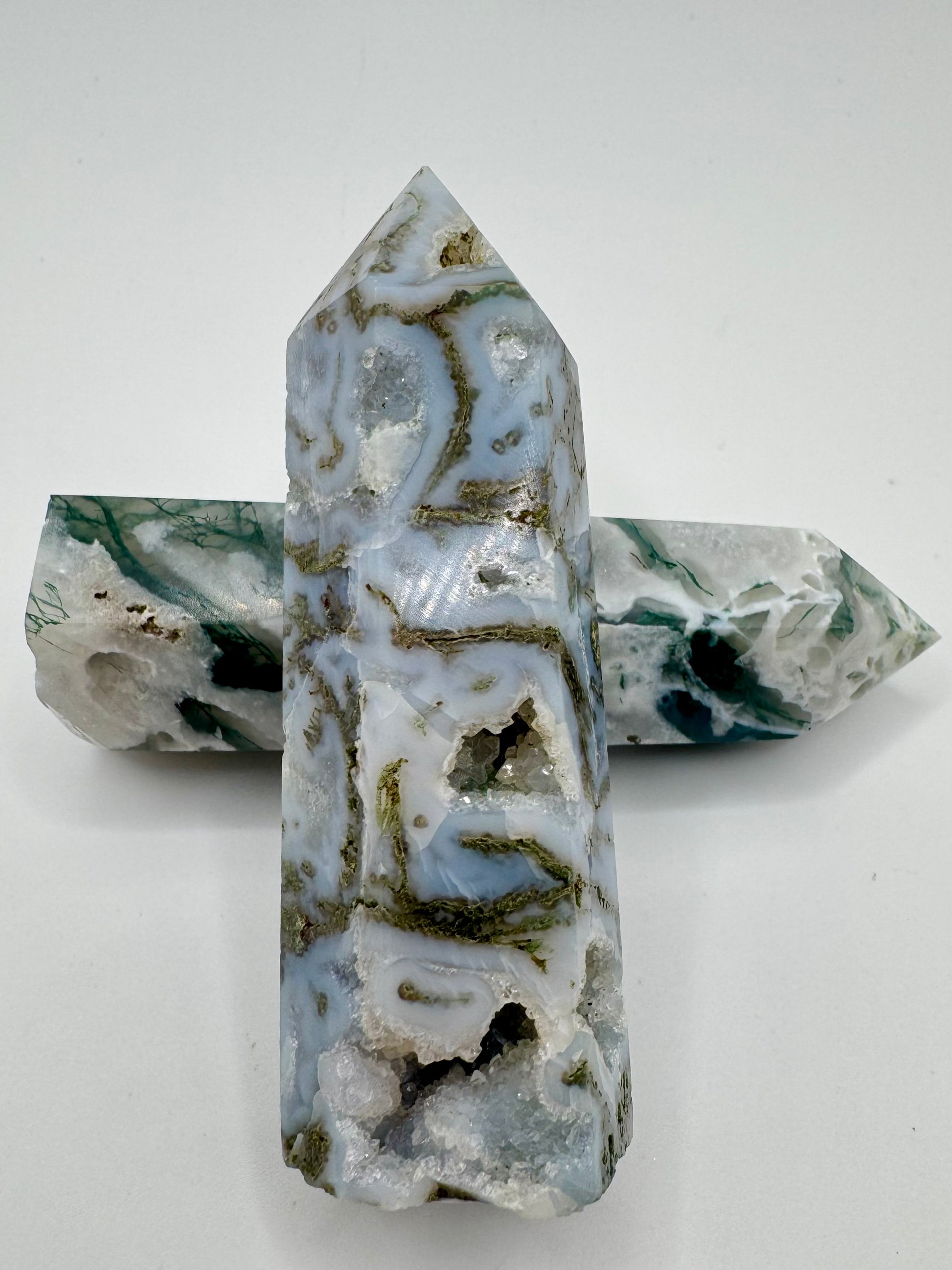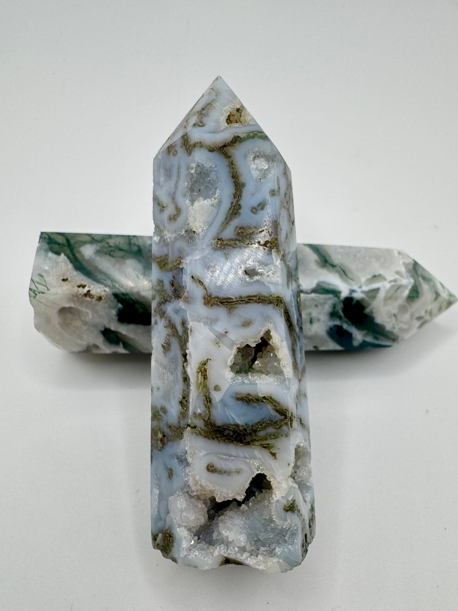 L’Agata è una pietra di radicamento, equilibrio e protezione, mentre il Quarzo Ialino è conosciuto per la sua capacità di amplificare l’energia e favorire la chiarezza.